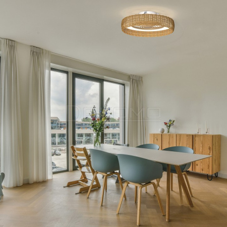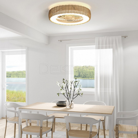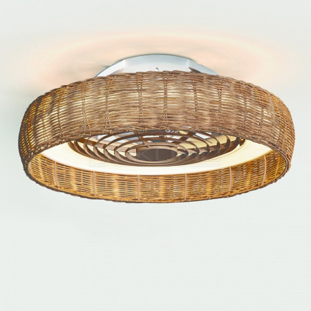 Ротанговый абажур вентилятора KILIMANJARO может быть установлен на разной высоте от потолка: вплотную к потолку, либо прилегая к вентилятору наполовину для прямого направления циркулирующего воздуха. Настройки цветовой температуры и скорости вентилятора контролируется с помощью пульта дистанционного управления или через приложение в смартфоне.