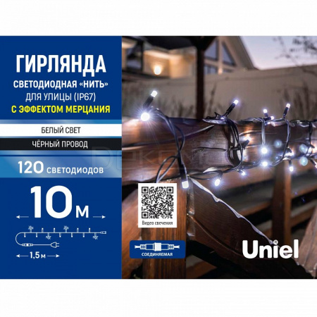 Светодиодная гирлянда с эффектом мерцания от Uniel — современное решение для создания чистого и яркого освещения с помощью белого света. Модель ULD-S1000-120/TBK WHITE впечатляет своим безупречным свечением благодаря 120 светодиодам, расположенным на 10-метровой длине провода. Черный провод идеально сочетается с чистым белым светом, создавая элегантный и современный внешний вид.