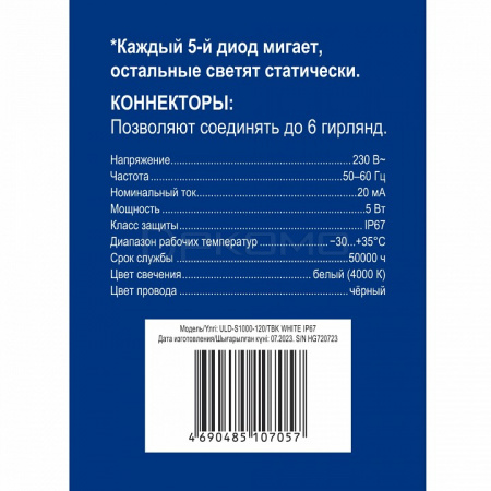 Технические характеристики гирлянды полностью соответствуют высоким стандартам качества. Степень защиты IP67 обеспечивает надежную работу в любых погодных условиях. Возможность соединения нескольких гирлянд позволяет создавать масштабные световые композиции длиной до 60 метров. Эффект мерцания добавляет динамичности и праздничности освещению.