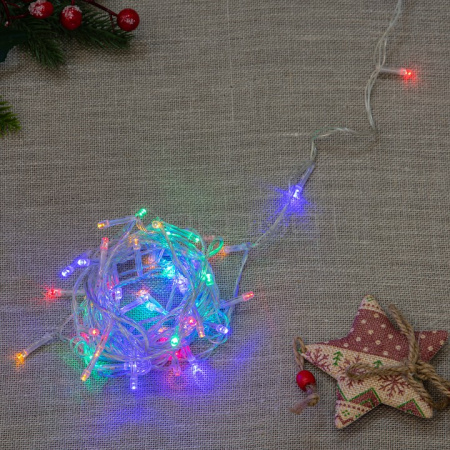 Гирлянда имеет длину 5 метров и оснащена 50 светодиодами, которые создают завораживающую игру разноцветного света. Прозрачный провод идеально сочетается с яркими огоньками, делая гирлянду универсальной для различных декоративных решений. Работает от сети 220В через сетевой кабель. Встроенный контроллер позволяет управлять различными режимами свечения, создавая неповторимые световые эффекты. Степень защиты IP20 обеспечивает безопасное использование гирлянды в помещениях.