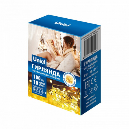 Гирлянда "Роса" от Uniel — уютное теплое сияние на батарейках. Масштабная светодиодная гирлянда для создания комфортной атмосферы без подключения к электросети. Представляем уютную светодиодную гирлянду "Роса", способную преобразить любое пространство благодаря 100 светодиодам, излучающим мягкий теплый свет на длине 10 метров. Медный провод обеспечивает надежность конструкции, а питание от батареек делает установку максимально простой и удобной.