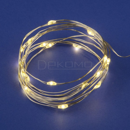 Особенности модели. Гирлянда оснащена двадцатью современными светодиодами, создающими равномерное теплое свечение без мерцания. Медный провод гарантирует долговечность и надежность конструкции. Питание от двух батареек типа АА обеспечивает автономную работу. Степень защиты IP20 гарантирует безопасное использование внутри помещений.