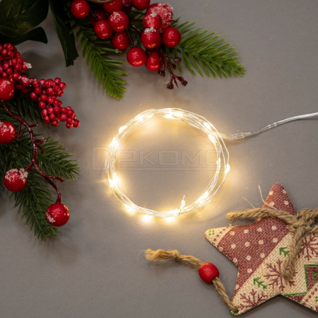 Преимущества выбора. Теплый белый свет создает комфортную и располагающую атмосферу. Компактные размеры и длина в 2 метра позволяют использовать гирлянду в ограниченном пространстве. Медный провод обеспечивает долговечность и надежность конструкции. Питание от батареек дает возможность размещать гирлянду в любом месте без привязки к розетке. Простота установки делает использование максимально удобным. Позвольте гирлянде "Роса" наполнить ваше пространство мягким и уютным светом. Создайте комфортную атмосферу с помощью этого стильного декоративного элемента, который станет идеальным решением для оформления как домашнего интерьера, так и праздничных мероприятий!