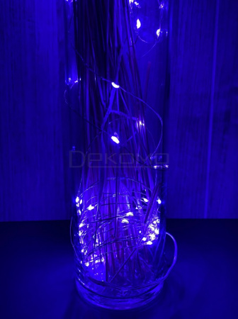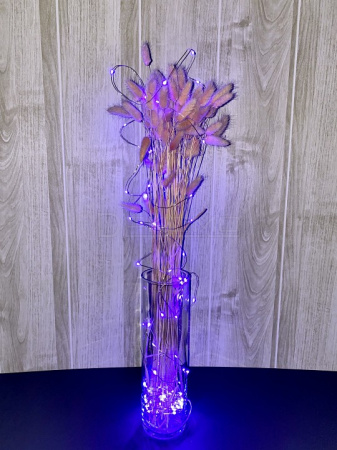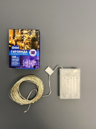 Преимущества выбора. Фиолетовый свет создает загадочную и волшебную атмосферу. Увеличенная длина в 10 метров позволяет использовать гирлянду для масштабных композиций. 100 светодиодов обеспечивают равномерное освещение. Медный провод гарантирует долговечность конструкции. Питание от батареек дает возможность размещать гирлянду в любом месте без привязки к розетке.