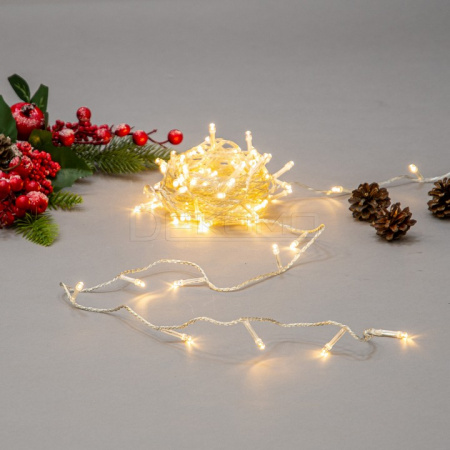 Гирлянда имеет длину 10 метров и оснащена 100 светодиодами, которые создают равномерное и комфортное освещение в теплых тонах. Прозрачная проводка гармонично сочетается с теплым светом огоньков, делая гирлянду универсальной для различных декоративных решений. Работает от сети 220В через сетевой кабель. Степень защиты IP20 обеспечивает безопасное использование гирлянды в помещениях.