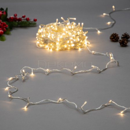 Гирлянда впечатляет своей длиной в 25 метров и оснащена 225 светодиодами, которые создают равномерное, комфортное освещение, напоминающее свет свечей. Прозрачная проводка идеально сочетается с теплым светом огоньков, делая гирлянду универсальной для различных декоративных решений и практически незаметной в интерьере.