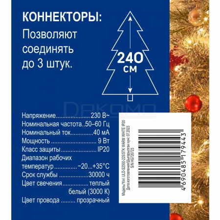 Особенностью модели является возможность соединения нескольких гирлянд между собой, что позволяет создавать масштабные световые композиции любой протяженности. Работает от сети 220В через сетевой кабель, степень защиты IP20 гарантирует безопасное использование в помещениях.