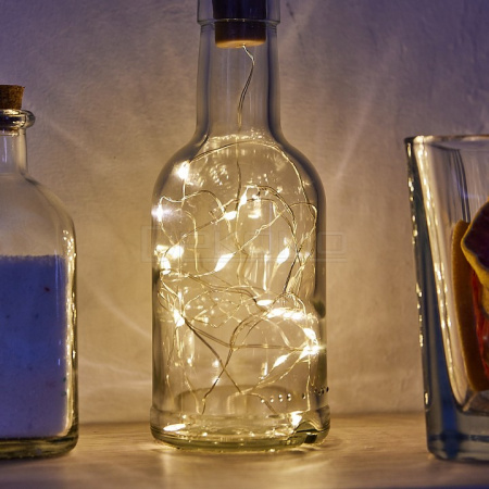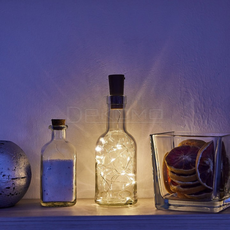 Преимущества выбора. Теплый белый свет создает комфортную и располагающую атмосферу. Компактные размеры и длина в 2 метра позволяют использовать гирлянду в различных интерьерах. Медный провод обеспечивает долговечность и надежность конструкции. Питание от батареек дает возможность размещать гирлянду в любом месте без привязки к розетке. Пробковое крепление упрощает процесс установки.