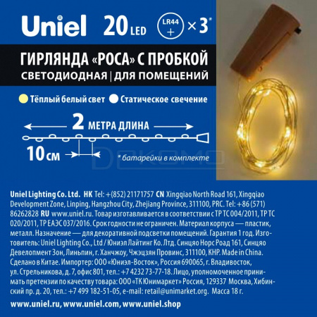 Гирлянда "Роса" с пробкой от Uniel — уютное украшение на батарейках. Изысканная светодиодная гирлянда для создания теплой атмосферы без подключения к электросети. Представляем элегантную светодиодную гирлянду "Роса" с удобным пробковым креплением, способную создать уютную атмосферу благодаря 20 светодиодам, излучающим теплый белый свет на длине 2 метра. Медный провод обеспечивает надежность конструкции, а питание от батареек делает установку максимально простой и удобной.
