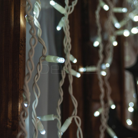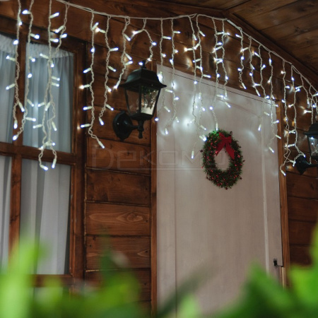 Гирлянда безопасна для использования в уличных условиях. Компактные размеры и продуманная конструкция позволяют легко монтировать гирлянду на различные поверхности. Гирлянду можно соединять в одну линию до 6 штук с помощью коннекторов, которые входят в комплект. Гирлянда с эффектом мерцания, каждый 5-й светодиод мигает остальные светят статически.
