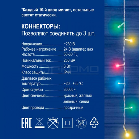 Прозрачный провод гармонично сочетается с любым интерьером, делая акцент именно на световом эффекте. Гирлянда безопасна для использования как помещениях, так и в уличных условиях. Компактные размеры и продуманная конструкция позволяют легко монтировать гирлянду на различные поверхности. Гирлянду можно соединять в одну линию до 3 штук с помощью коннекторов, которые входят в комплект. Гирлянда с эффектом мерцания, каждый 5-й светодиод мигает, остальные светят статически.