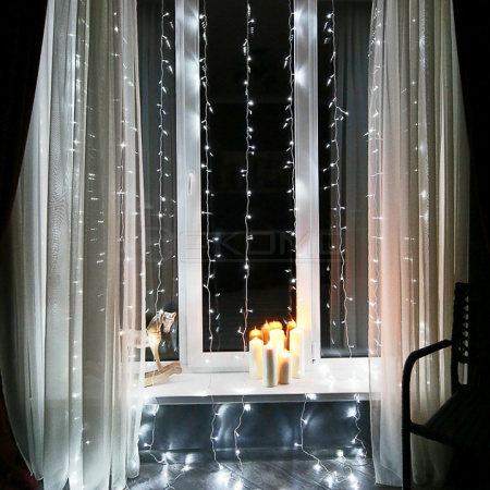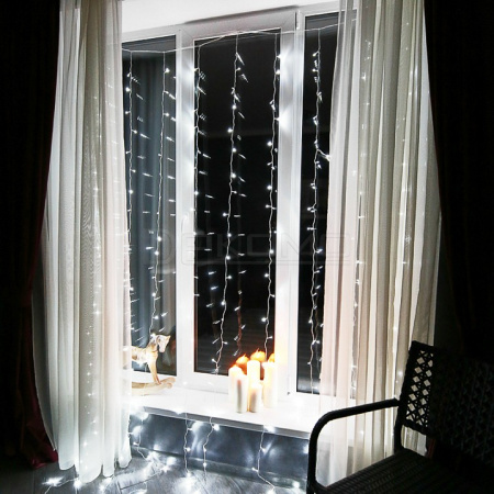 светодиодная гирлянда Занавес световая:динамическое свечение, 8 режимов свечения, расстояние между нитями 15 см, шаг светодиодов 10 см, предназначена для установки в горизонтальном положении
