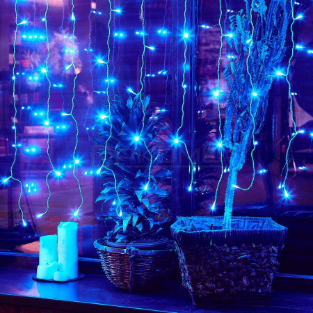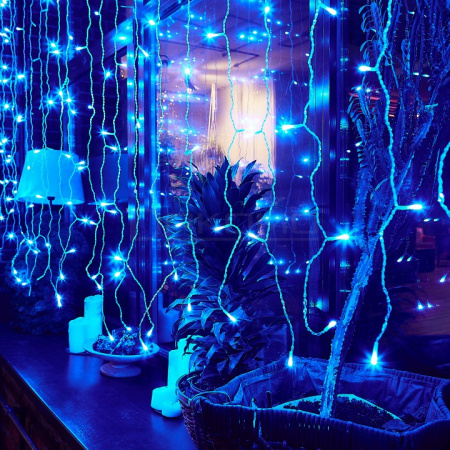 Занавес светодиодный обладает защитой IP44 и работает при температурах от -20°C до +35°C, что позволяет использовать его как в помещении, так и на улице под навесом. Возможность соединения нескольких модулей помогает создавать масштабные световые композиции. Прозрачный провод делает монтаж максимально аккуратным.