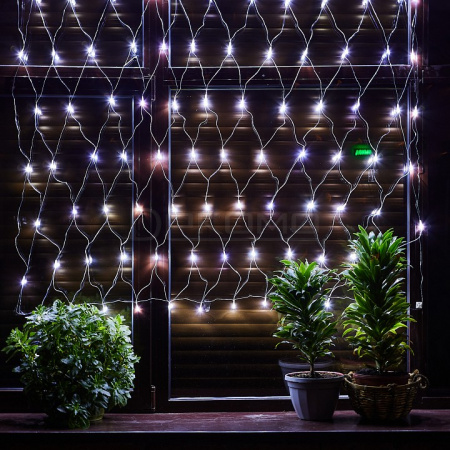 Квадратная сетка размером 1,5х1,5 метра с 96 белыми светодиодами воссоздает завораживающую игру зимних огней, напоминающую танцующие снежинки в лунном свете. Динамический эффект мерцания придает обычному освещению особую выразительность и волшебство. Возможность соединения нескольких секций позволяет создавать масштабные композиции для украшения фасадов, окон, садовых конструкций или интерьеров.