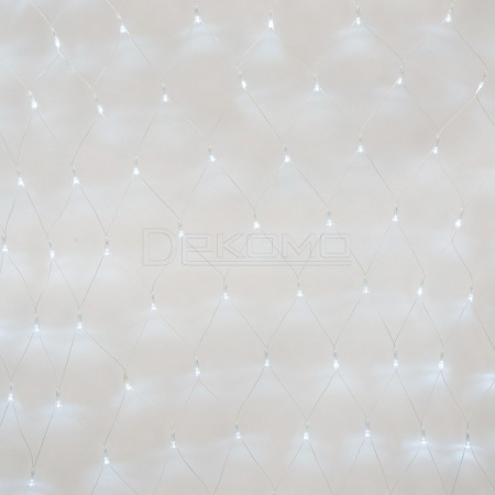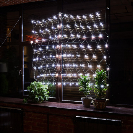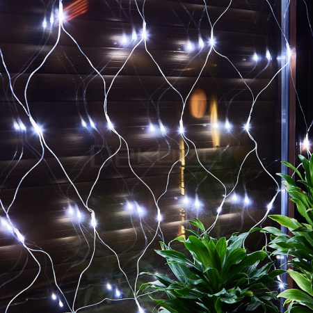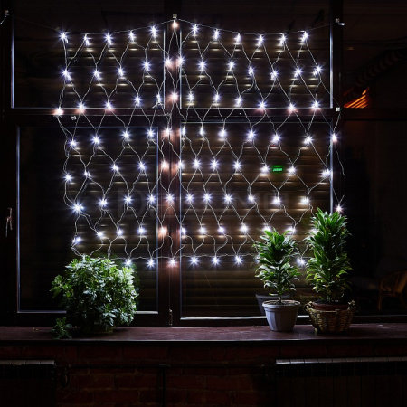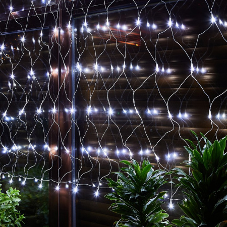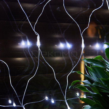 Квадратная сетка размером 1,5х1,5 метра с 96 белыми светодиодами создает ровное статичное свечение, напоминающее зимний иней. Особенность модели — возможность соединения нескольких сеток между собой для создания масштабных световых инсталляций.