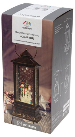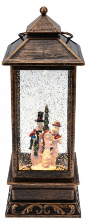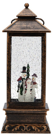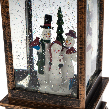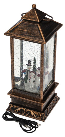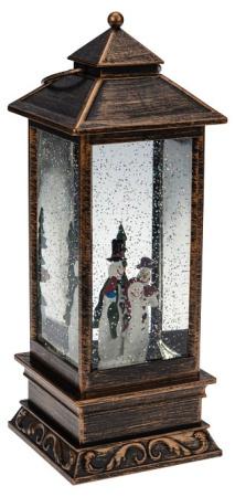 Декоративный фонарь с эффектом снегопада и подсветкой «Новый год» перенесет вас в атмосферу зимней сказки, где среди праздничных огней и домашнего уюта стоит наряженная елка, а дети радуются подаркам. Оригинальное интерьерное украшение выполнено в бронзовом цвете, внутри колбы находятся фигурки ели и Снеговиков. Вихрь серебристых блесток, подсвечиваемых диодами теплого оттенка, имитирует зимнюю вьюгу. Фонарь питается от 3 батареек типа AA и может работать через USB-кабель с сетевым адаптером.