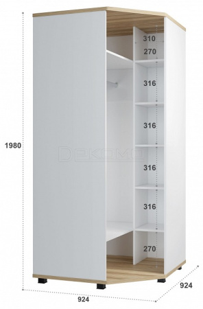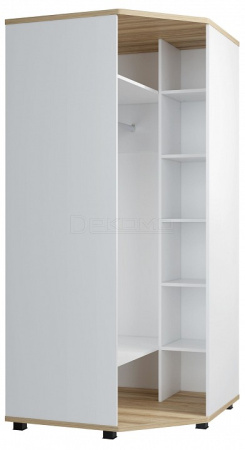 Платяной угловой шкаф СкайЛайт СЛ-01К станет замечательным дополнением для обустройства комфортной и функциональной детской или подростковой комнаты. За распашной дверью находится штанга для вешалок-плечиков. Антресольная и нижняя полки предназначены для хранения сложенной одежды, белья, различных аксессуаров и коробок с обувью. Фасад изготовлен из МДФ. Модуль может быть собран как в "правом", так и в "левом" варианте.
