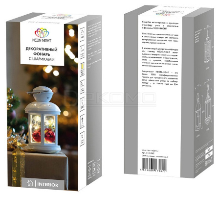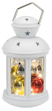 Декоративный фонарь представляет собой корпус белого цвета аутентичного исполнения, за стеклом находятся небольшие елочные шарики, подсвечиваемые диодной мини-гирляндой. 12 диодов излучают теплый белый свет и питаются от 2 батареек типа АА. Металлизированная глянцевая поверхность шариков эффектно играет в световом потоке, отбрасывая яркие блики на окружающие предметы. Светодиоды экономичны, безопасны и долговечны. Фонарь с шариками станет великолепным украшением праздничного и повседневного интерьера.