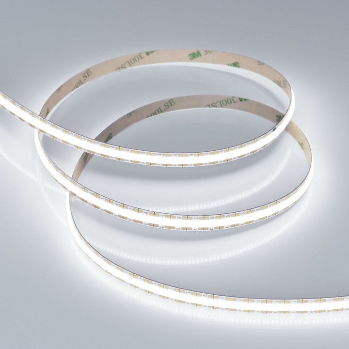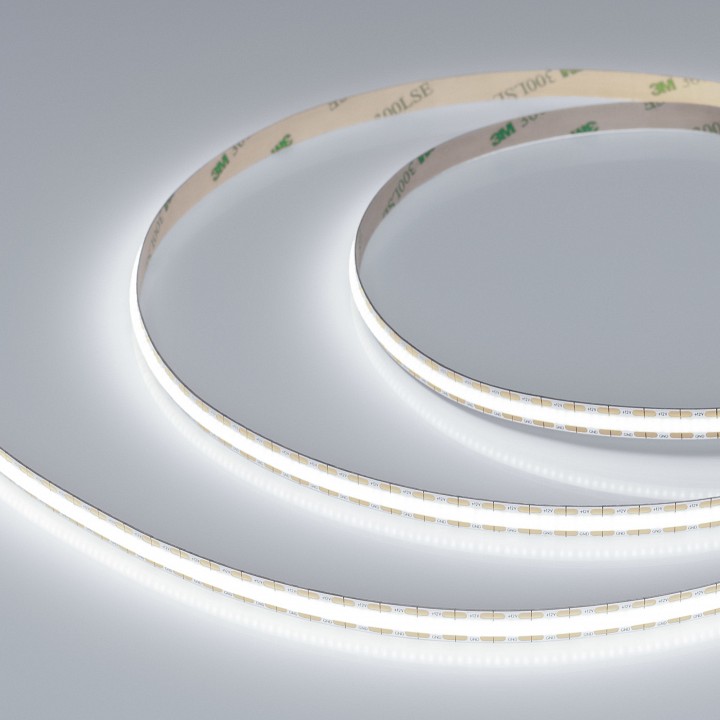 Лента COB сплошной засветки без видимых светодиодов. Кристаллы CSP 528 шт/м. Цвет свечения БЕЛЫЙ 6000K, индекс цветопередачи CRI>90, угол 170°. Мощность 11 Вт/м, питание 12 В. Размеры 5000х8х1.6 мм. Мин.отрезок 7.58 мм, 4 светодиода. 3M скотч для установки. Пакет 5м. Цена за 1м.