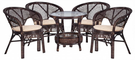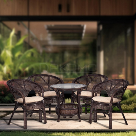 Комплект PELANGI из натурального ротанга это произведение искусства, созданное вручную мастерами с многолетним опытом. Метод выгибания и плетения ротанга делает каждый предмет неповторимым и уникальным. Ротанг это натуральный материал, который отличается не только прочностью и долговечностью, но и экологичностью. Он не содержит вредных веществ и прекрасно вписывается в любой интерьер. Комплект из ротанга это идеальное решение для тех, кто ценит комфорт и уют. Он легкий и мобильный, его легко перемещать по комнате. Комплект поставляется в собраном виде, что значительно упрощает его транспортировку. Комплект состоит из 4 кресел с подушками и стола.