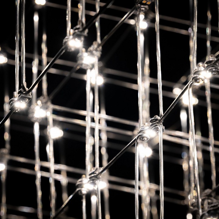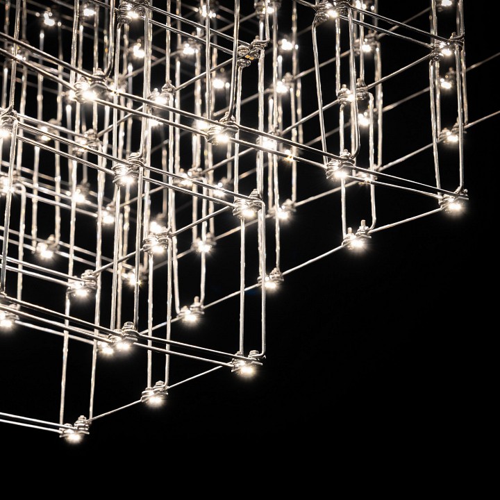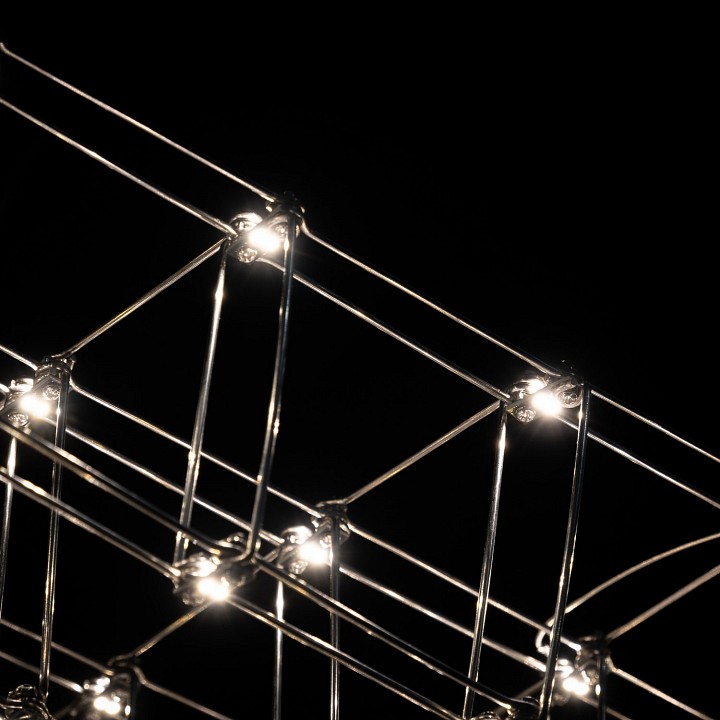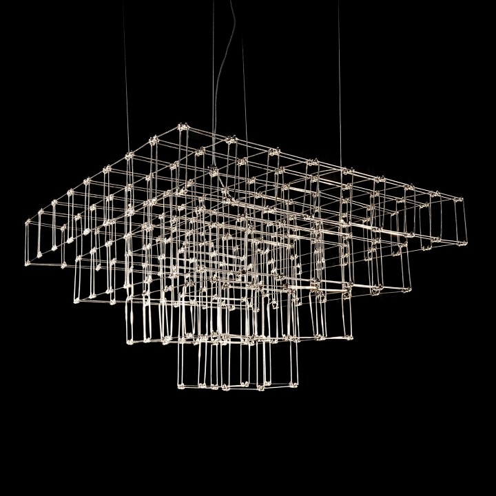 Подвесная дизайнерская люстра Jacqueline изготавливается в ручную из тонких стальных прутков и светодиодов. Модель выглядит легкой, практически невесомой. Люстра будет прекрасно смотреться в гостиной, спальне, холле, столовой.Светодиоды на пересечениях линий подчеркивают очертания люстры, усиливая воздушность и легкость конструкции.