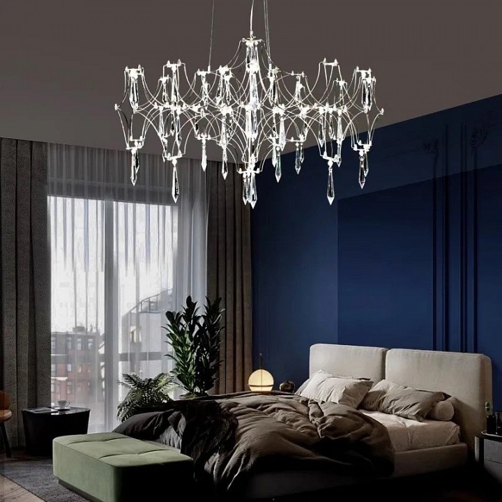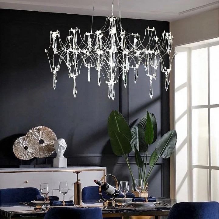 Дизайнерская люстра Emilia сразу рождает ассоциации с королевской роскошью. Обилие сверкающих подвесок из стекла или хрусталя создает ощущение праздника. Замысловатые переплетения изогнутых элементов каркаса смотрятся одновременно просто и необычно. Повторяя традиционный дизайн классических люстр, подвесной светильник выглядит воздушным, легким за счет использования тонких прутков нержавеющей стали. Модель гармонично смотрится в классическом, неоклассическом и современном интерьере.