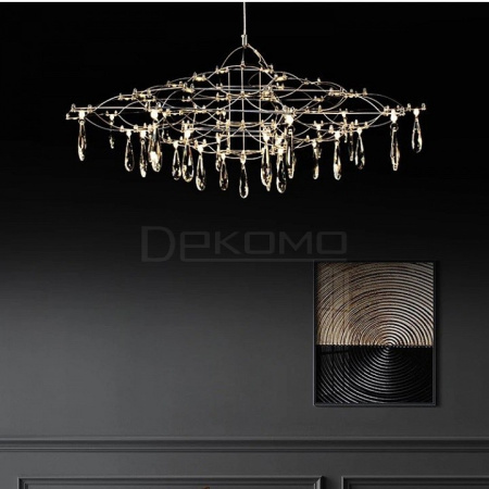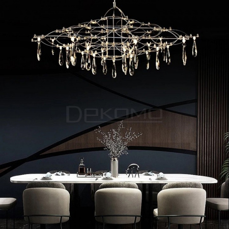 Изысканная люстра ручной работы Shakira навевает воспоминания о мелодиях арабского востока. Плавные ритмичные линии каркаса напоминают характерные орнаменты. Вытянутая по горизонтали форма ассоциируется с традиционными очертаниями подвесных восточных светильников. Подвески из граненого стекла привносят в композицию неожиданные акценты, добавляя роскоши и блеска. Каркас люстры выполняется из прочных прутков нержавеющей стали.