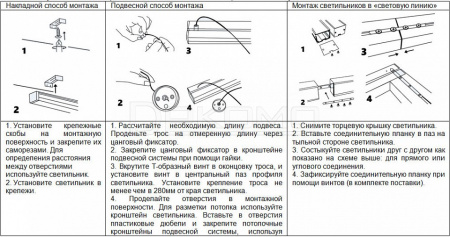 три способа монтажа светильника:накладной способ монтажа подвесной способ монтажа vонтаж светильников в "световую линию"