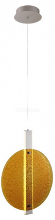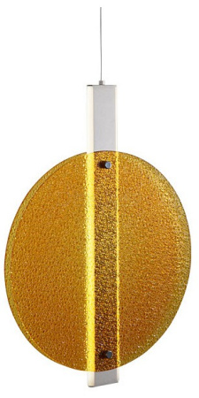 Металлическое основание подвеса гальванизировано в цвет никеля. Корпус плафона выполнен из сплава алюминия с цинком и гальванизирован в цвет основания. Светодиодные источники света закрыты матовым акрилом. Подвес декорирован фактурным стеклом, окрашенным в массе в желтый цвет.