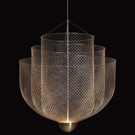 Дизайнерская люстра Meshmatics представляет собой три сетчатых купола, сходящихся в одной точке. Световой элемент украшен стальной полусферой. Свет проходит сквозь тонкое плетение металлических нитей и образует облако мягкого рассеянного света. Люстра выполнена в цвете латунь.
