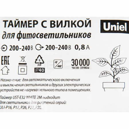 UST-E32 WHITE 2M Таймер с вилкой и разъемом L.N для фито светильника. 220В. 150Вт. Провод 2 метра.