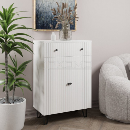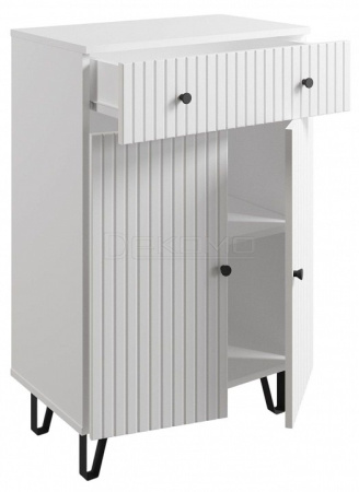 Тумба с 2-мя ящиками и дверью. в белом цвете и фрезеровкой по фасадам - идеальное решение для вашего интерьера. Простые формы легко впишутся в любой стиль помещения, а белый цвет придаст ему светлую и воздушную атмосферу. Металлические стильные ножки добавят современный шарм и легкость дизайну. Коллекция "Лайн" - стильное и функциональное решение для хранения, создающее уютное пространство, которое будет радовать вас каждый день.