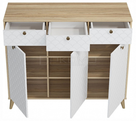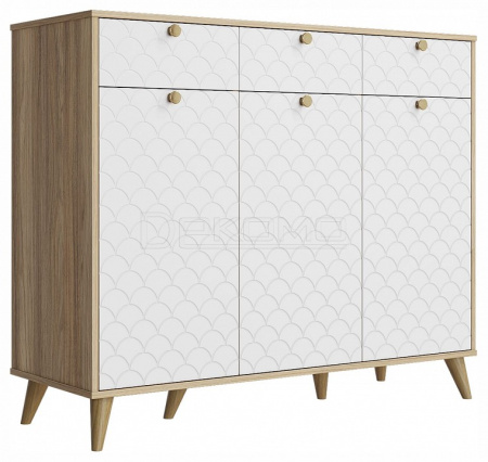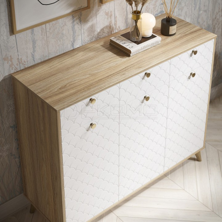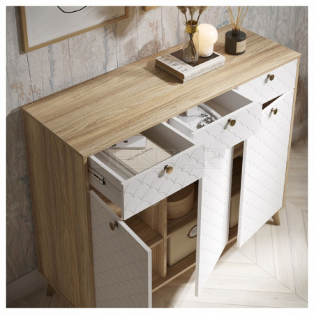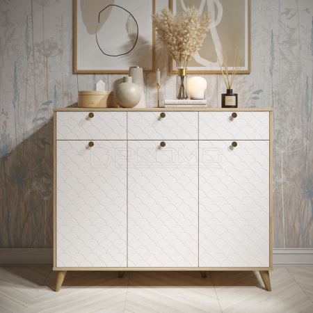 Тумба Велламо ВО-05 станет функциональным и стильным дополнением гостиной комнаты или спальни. Комод визуально поделен на три секции с выдвижными ящиками и распашными дверцами. Стильные и необычные МДФ фасады с фрезеровкой и металлическими ручками. Дно ящика двп 3 мм. Высота опоры из массива дерева 120 мм. Фурнитура: телескопические направляющие полного выдвижения без доводчиков, ручки металл, опоры деревянные.