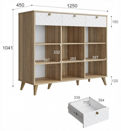 - 3 дверцы, 3 ящика, 6 полок