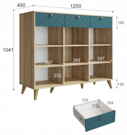- 3 дверцы, 3 ящика, 6 полок