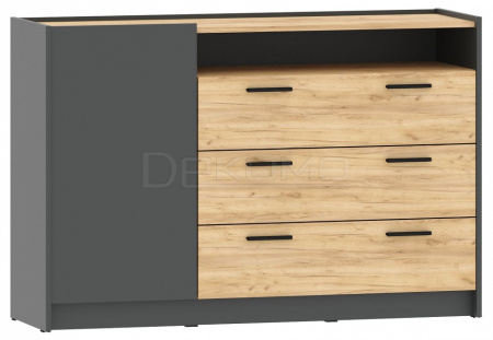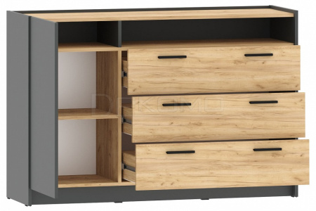 Большая вместительная комбинированная тумба из коллекции Оттавия. Тумба оборудована распашной дверцей, тремя выдвижными ящиками на направляющих полного выдвижения и открытой полкой.