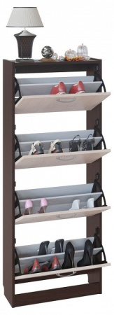 Высокая и компактная тумба для обуви в классическом исполнении. Модель имеет четыре отделения по две полки в каждом и вмещает в себя примерно двенадцать пар невысокой обуви на плоской подошве. Удобно и практично. Благодаря маленькой глубине — всего 220 мм, обувница не будет занимать много места.