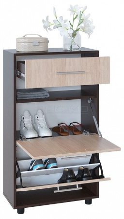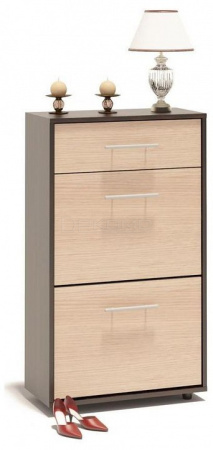 Вместительная тумба для обуви шириной 600 мм ТП-2. Верхний выдвижной ящик вместит всё, что нужно взять с собой, выходя из дома. Средняя дверь оснащена откидывающимся механизмом со специальными полками для размещения обуви, который обеспечивает удобство хранения и легкий доступ к необходимой паре кроссовок или туфель. За нижней дверью также располагается отсек для хранения обуви.