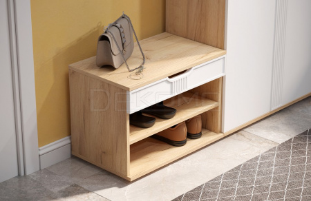 Тумба для обуви Эмилия ЭЛ-44 – компактная модель для комфортного переобувания в прихожую. Лаконичное изделие оборудовано двумя полками для обуви и сиденьем, под которым находится удобный ящик для хранения чистящих средств, щеток или зонта. Высота опоры 20 мм.
