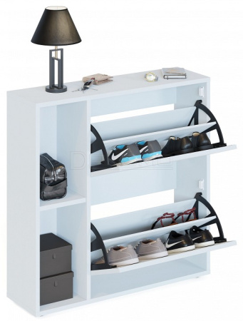 Тумба для обуви с двумя закрытыми отделениями и двумя открытыми нишами станет стильным дополнением квартиры или дома. Основное преимущество данной модели - это ее вместительность при небольших габаритах. Тумба вмещает не менее 8 пар обуви на полках. Сверху можно разместить ключи, бижутерию, сумки. А в боковых нишах предусмотрено место для хранения более крупных аксессуаров - зонты, шапки и прочее. Благодаря своему лаконичному дизайну тумба для обуви впишется в любой интерьер дома или квартиры. Удобные вырезы вместо ручек на фасадах создают безопасное пространство.