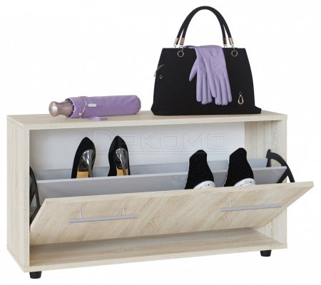 Широкая низкая тумба для обуви. Дверь оснащена откидывающимся механизмом со специальными полками для размещения обуви, который обеспечивает удобство хранения и легкий доступ к необходимой паре кроссовок или туфель.