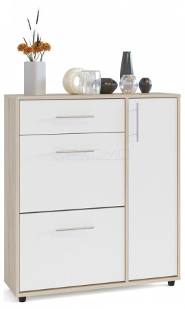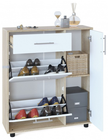 Вместительная тумба для обуви оборудована выдвижным ящиком, двумя отсеками для обуви и полками за дверцей.