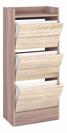 На верхней крышке предусмотрен бортик, чтобы исключить падение предметов. Имеет 3 откидных секции, в каждой возможно разместить обувь в два ряда. Ориентировочно поместится 18-20 пар обуви.