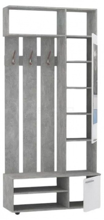 Прихожая оснащена крючками для одежды и сумок, а внизу располагаются две полочки для обуви. Сверху расположены полки для хранения головных уборов. Шкафчик с зеркальной дверью укомплектован четырьмя полками.