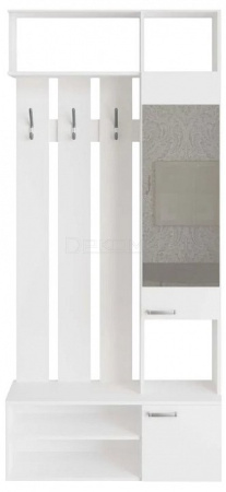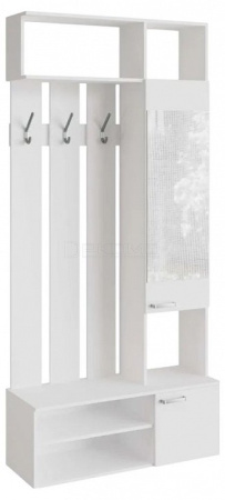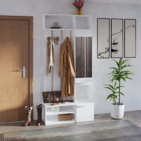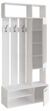 Прихожая оснащена крючками для одежды и сумок, а внизу располагаются две полочки для обуви. Сверху расположены полки для хранения головных уборов. Шкафчик с зеркальной дверью укомплектован четырьмя полками.