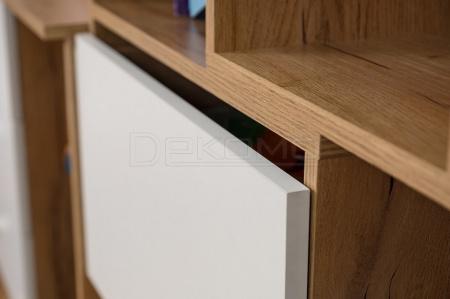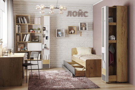 Уникальный в своем роде стеллаж-трансформер выступает визитной карточкой коллекции Лойс. Модуль раздвигает и сдвигается обратно, меняя свою ширину от 989 до 560 мм. Вы можете установить стеллаж автономно или же комплектовать с другими шкафами серии. Для максимальной безопасности секции стеллажа фиксируются между собой на межсекционные стяжки.