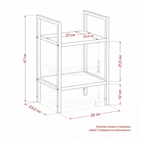 Нижняя полка крепится на разных высотах, что позволяет адаптировать стеллаж под книги, технику или корзины.