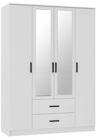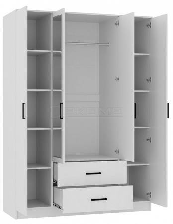 Вместительный 4-х дверный шкаф - универсальное решение для организации хранения одежды в спальне или прихожей. Модуль оснащен стационарной штангой для хранения одежды на плечиках, двумя выкатными ящиками и набором полок.