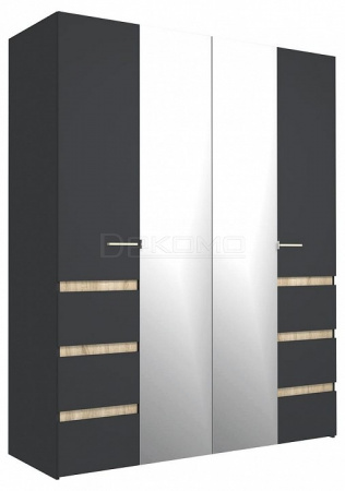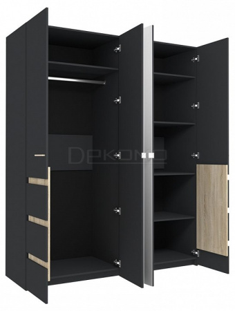 Шкаф распашной четырёхдневный с декоративными вставками дуб сонома. Особенно эффектно смотрится двери с зеркалами в сочетании с цветом антрацит. За фасадами вы найдете отсек с хромированной штангой и антресолью и секцию с полками.