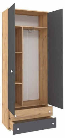 Шкаф из коллекции«Лойс» - практичное и функциональное решение для организации хранения в детской. Наполнение шкафа продумано для мелочей. Выдвижная штанга подойдет для размещения одежды на плечиках, комплект полок - для одежды в сложенном виде. В ящиках хватит места для гранения белья и других личных вещей ребенка. Кроме того, Вы имеете возможность выбрать цвет фасада шкафа: две белые дверцы, две в цвете графит или их комбинацию.
